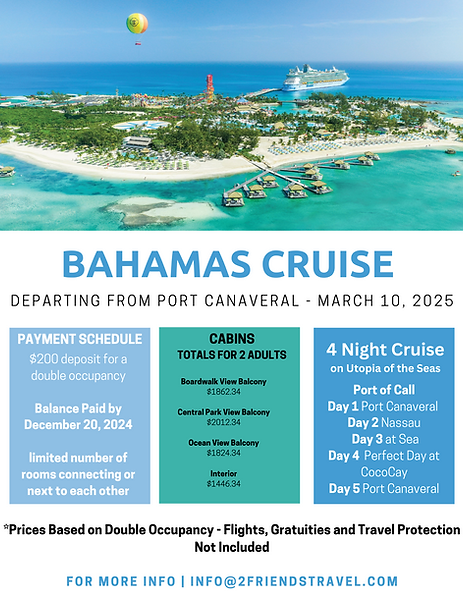 2 Friends Travel regularly creates group travel options. These groups are open for anyone to join! These are great opportunities to explore the world without having to deal with the hassle of planning. We can often times get better group pricing as well, which is always a plus! And, no need to worry about traveling "in a group." You aren't bound to do anything with "the group" at all. Please contact us today with any questions!